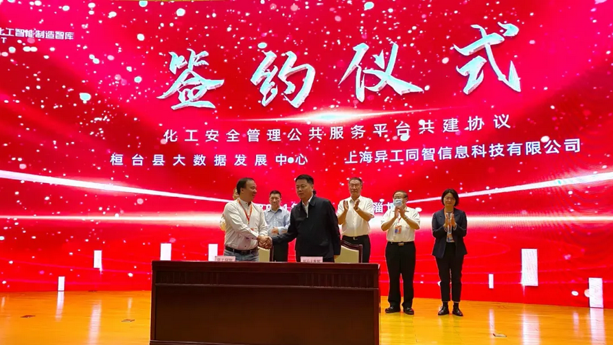 簽約儀式上,上海異工同智信息科技有限公司與桓臺縣大數據發展中心簽署共建協議,正式啟動化工安全管理公共服務平臺共建項目。