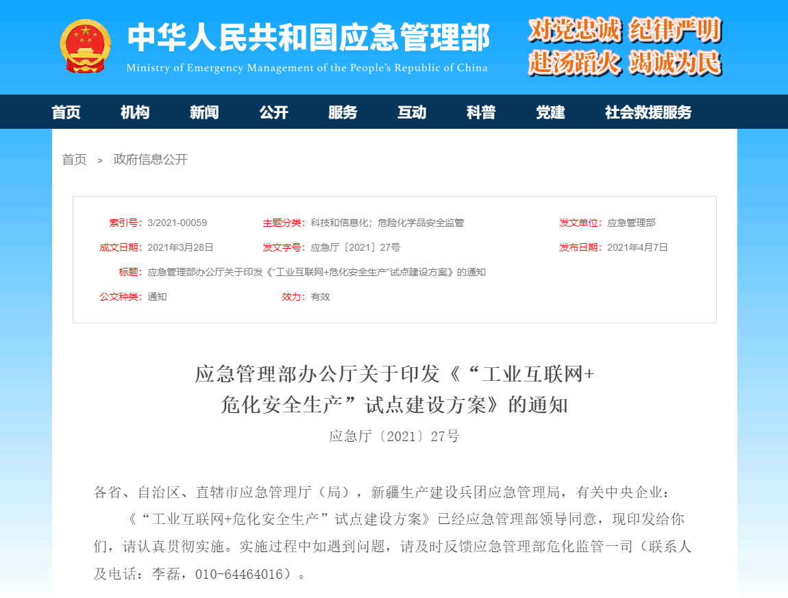 4月7日,國家應急管理部官網正式對外印發《“工業互聯網+危化安全生產”試點建設方案》。